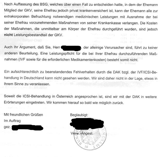 - Seite 1 eines Briefes des Bundesversicherungsamtes. Hierin wird bestätigt, daß die Gesetzliche KV einerseits die Kosten übernehmen muß, die bei ihrem Versicherten anfallen und andererseits die Kosten tragen muß, die keinem Ehegatten zugeordnet werden können und daher als extrakorporal bezeichnet werden.