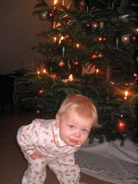 Ruben hatte Heilig Abend und am 1. Feiertag ein paar gesundheitliche Probleme, die aber für uns eher von Vorteil waren (z.T.): Mittags hatte er ein bischen erhöhte Temperatur und war daher um 14:00 in der Kirche ganz lieb auf dem Schoß von Oma. Kein Mucks kam von ihm. Und beim Essen war er auch eher ruhig und gesittet als Rambo II. Nur am 1. Feiertag hatte er dann noch mal so eine Ladung in die Büx gemacht, daß ALLES ausgewechselt werden mußte UND wir nix mit hatten.... zum Glück war unter den Geschenken eine Unterwäsche Garnitur und ein Schlafanzug. So lief er dann rum ;-)