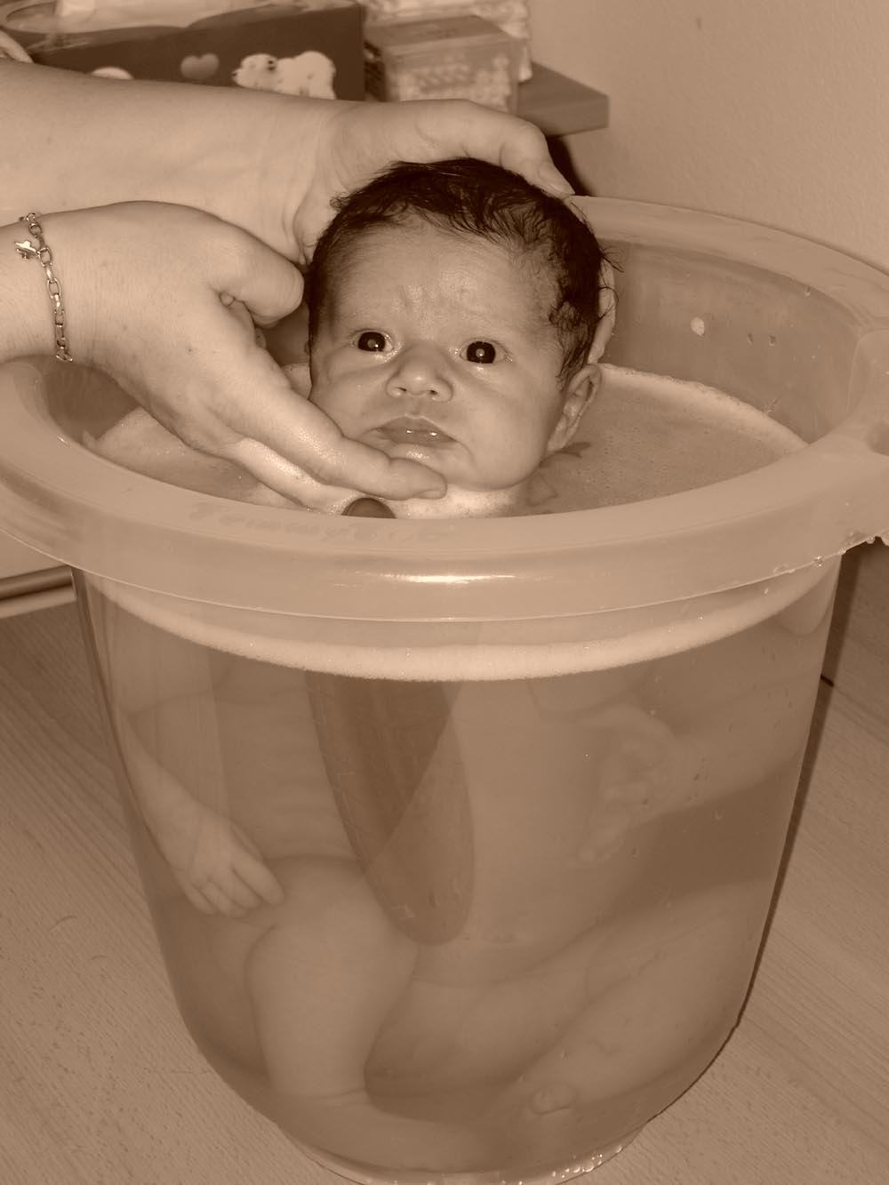 Die Wehen spürte ich noch genauso wie vorher. Tropf hing grade nicht dran weil die Hebi wohl nicht ganz bei der Sache war…. Die Tropf-Flüssigkeit lief auf den Boden….