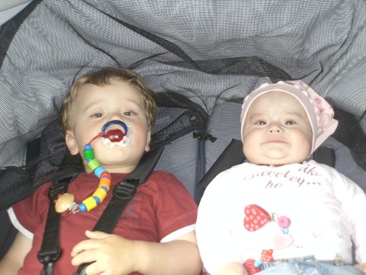Erst in die Krabbelgruppe, dann kam Aaron, im Schweinsgalopp mit Jaannes ( Laufrad) + Bente im Tragesack und Aaron im KiWa in den Wald + HUnd !!! um die Bande müde zu tragen, schieben, laufen