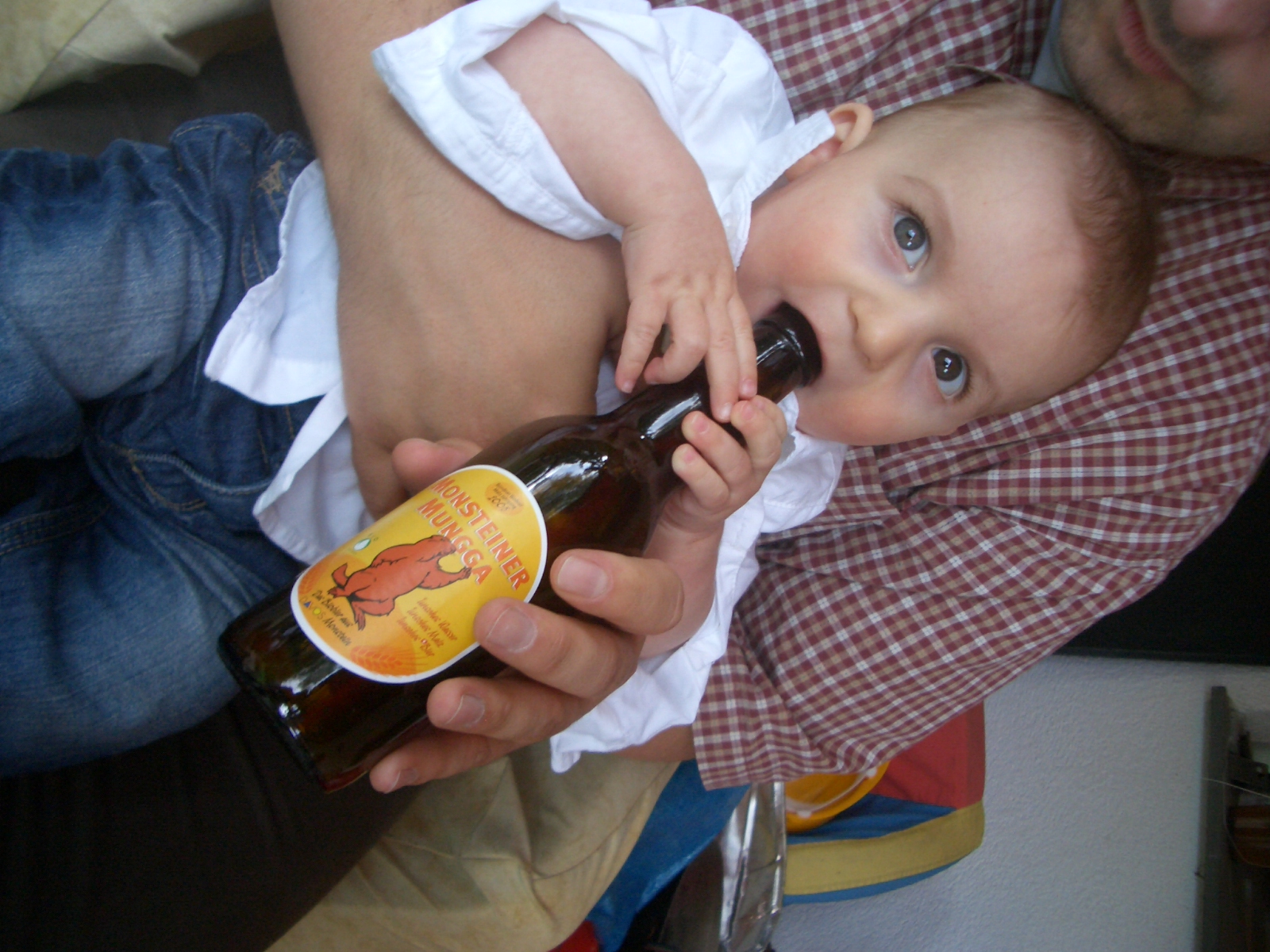 und was macht er ab liebsten... er nuckelt auf Papas Schoss an der kalten Bierflasche
