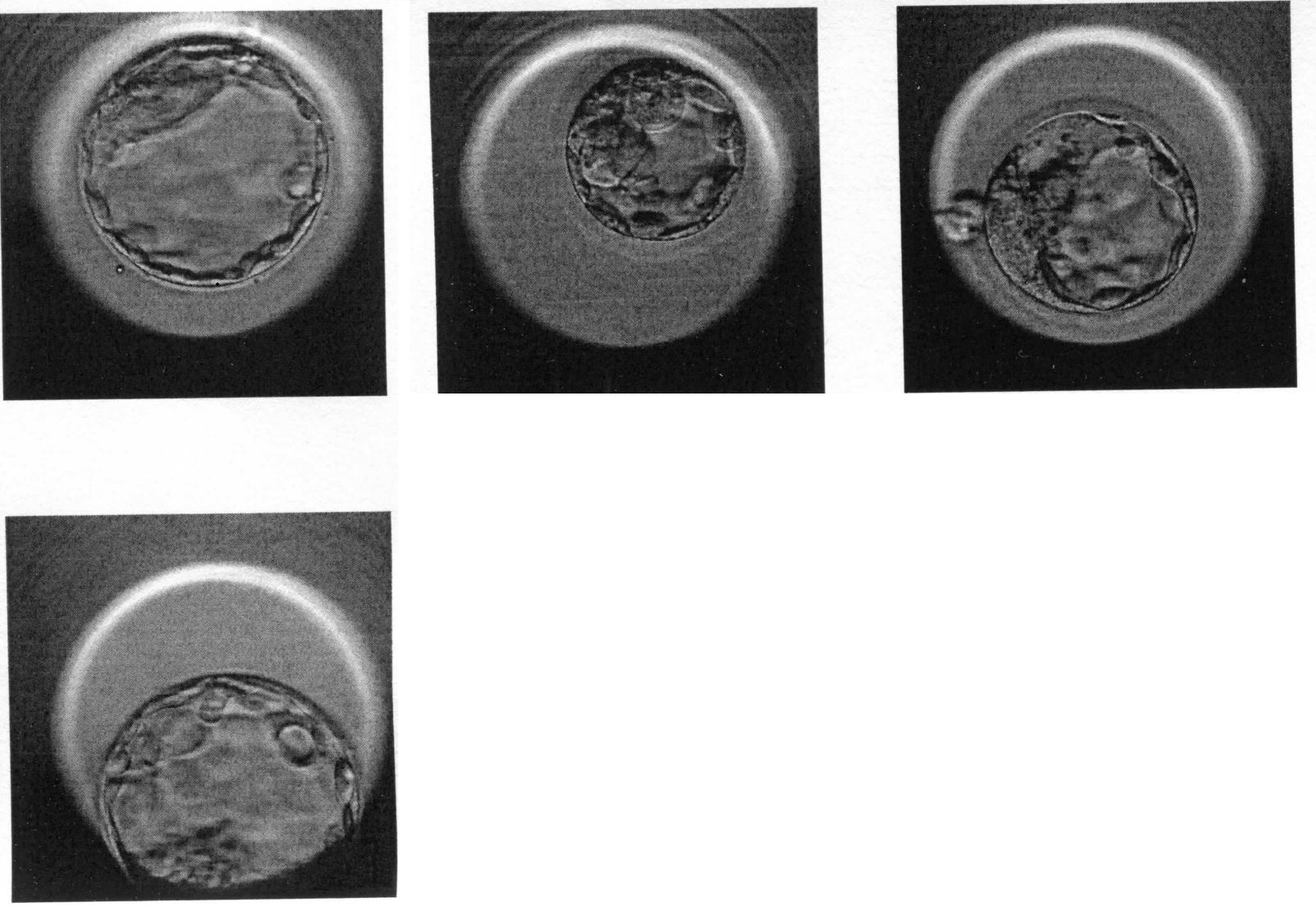 Die beiden BC für die Vitrifikation sind in geringerem Maß expandiert, d.h. bis zum Schlüpfen dauert es noch einen weiteren Tag. (2BB, 3BB) Die "Bläschen" sind wahrscheinlich Cumuluszellen, die auf der Oberfläche der Zona anhaften, keine Zellen der BC.