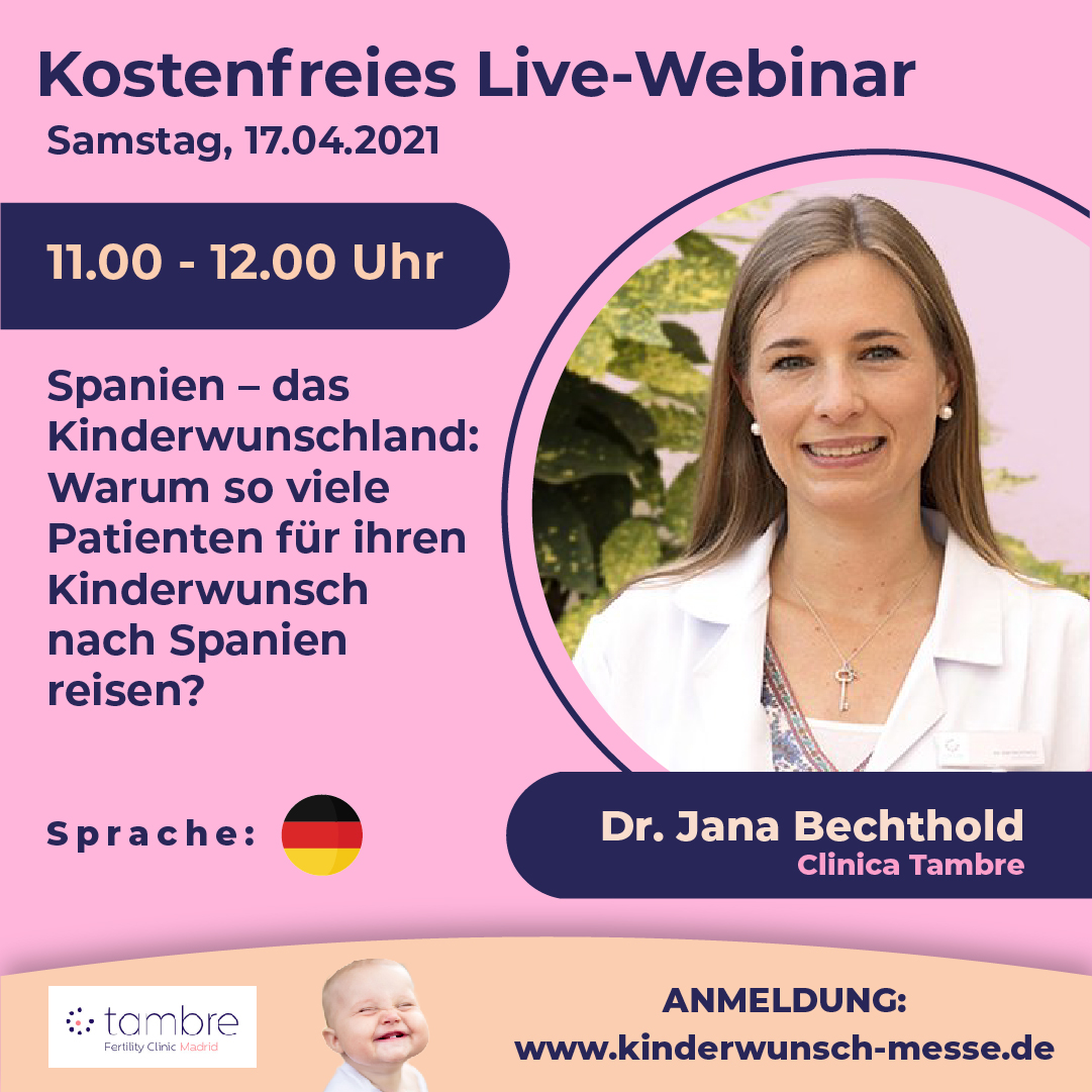 Während der Internationalen Online-Kinderwunsch-Messe (Kostenlose Registrierung über www.kinderwunsch-messe.de) bieten wir viele informative und kostenlose Webinare von Kinderwunsch-Experten aus renommierten europäischen Kinderwunschkliniken an.