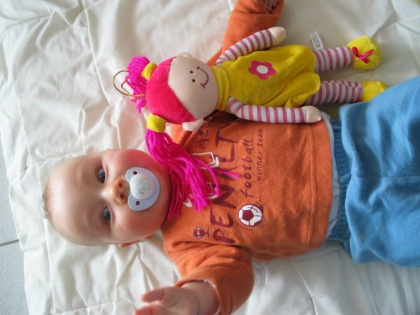 jetzt schlafen beide...zum glück, robin war so knatschig, daß ich schon befürchtete, daß er dann beim mittagessen wieder einpennt....hab ihn ins kizi gelegt und eingeschläfert (ich muss den beiden immer "wer hat die schönsten schääääfchen, die hat der goldne moooond, der hinter unsern bäääumen am himmel droben wohnt" vorsingen, das finden sie so grausam, daß sie freiwillig nach 3 minuten einschlafen) :lol: und ronja liegt hier im wohnzimmer mit ihrer Lucy im arm. hab den beiden nämlich jetzt so ganz weiche puppen gekauft. robin seine ist die Susi (ich sag doch zu robin immer "susi" weil er so viel weint und ne heulsuse ist).