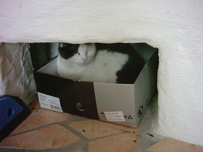 Unsere Katze sucht komischerweise nicht die Wärme. Sie hätte ja das schönste Kaminbänkchen was sich eine Katze vorstellen kann, aber sie bevorzugt Pappkartons zum Schlafen. Sie ist also sehr genügsam!