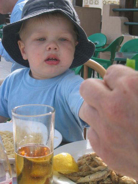 Beide haben in Spanien Boquerones frites gegessen: das sind so Mini-Sardinen gegrillt bzw. ausgebacken. Mit Gräten und Schwanz. Sind echt lecker, nur daß beide Kinder sie so auch essen hätte ich nicht gedacht!