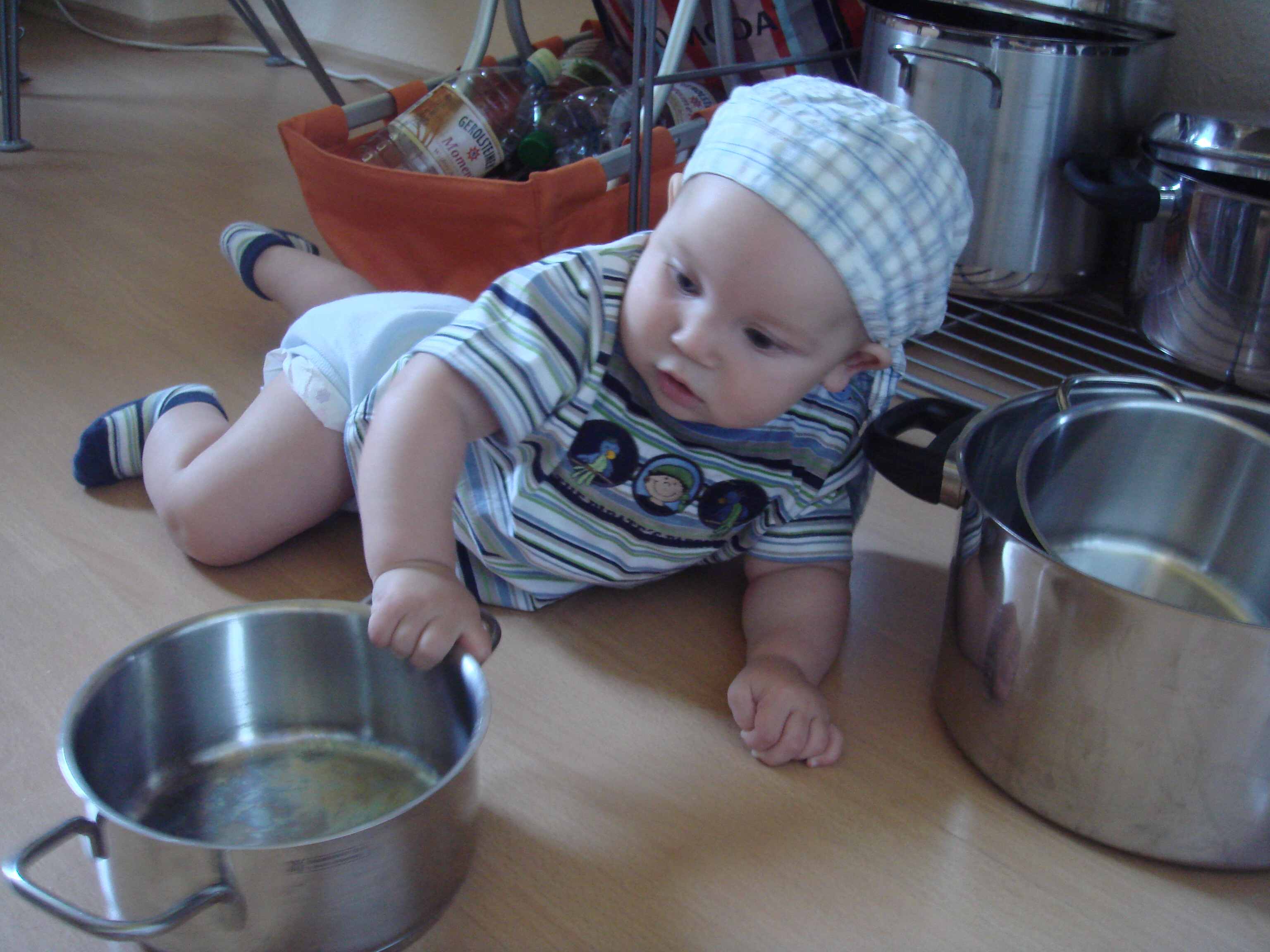 Was soll ich sagen,der kleine Mann hält mich in Schach,aber gaaanz lieb....lag letztens im Flur neben der Bodenvase ,die war natürlich umgekippt,weil er sich daran hochziehen wollte.... :verneig: :verneig: :verneig: habe ihn aus der Pfütze und aus den Sonnenblumen geholt ... :jaja: und sonst ist eben Action angesagt...steht ruck zuck an der Couch und läßt dann mal logger die Hand los,TV ist sehr interessant,Papierkorb und Toilettenpapierrollen etc.Bei den Töpfen gabs letzens mal kurz Geschrei ,weil er sie sich so schnell aus dem Regal gezogen hat das es ordentlich schepperte :P :cry: :P