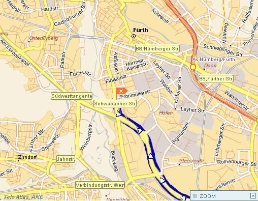 auf der Südwesttangente fahren bis zur Ausfahrt Fürth Stadtmitte - glaub ich so heißt die - und unten nach rechts fahren. Das ist schon die Schwabacher Str. Jetzt nur noch 300m geradeaus. Man kommt dann auf eine Ampel zu mit einer Rechtsabbiegerspur. Genau am Anfang der Abbiegespur geht es für euch rechts rein auf den Parkplatz.
