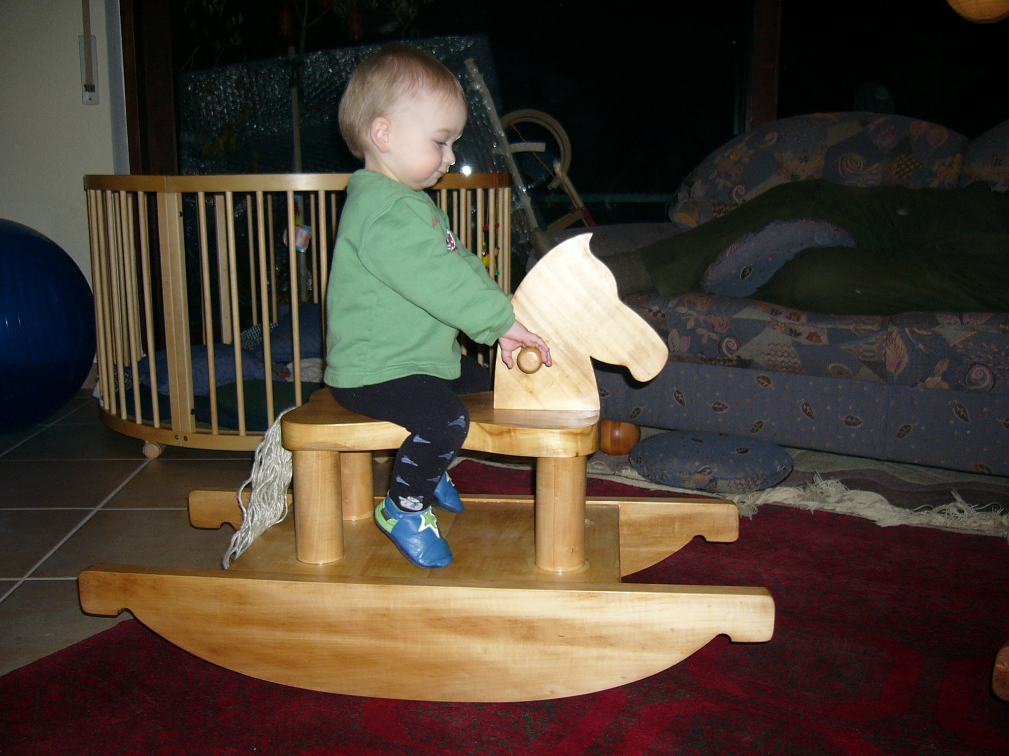 ...und hier noch Tilman und sein Schaukelpferd (hat Opa für uns gemacht: Eins aus MAhagoni und eins aus Lindenholz!)