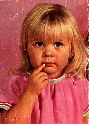 Leider habe ich gar keine Kinderbilder von mir zu Hause, sind alle noch bei meinen Eltern. Aber das hab ich gefunden (zwar nicht mehr ganz so süß, aber trotzdem. Ich habs abfotografiert, ging nicht wirklich gut und sieht breiter aus, als es ist, so breit bin ich erst später geworden... :roll: *mecker* ):