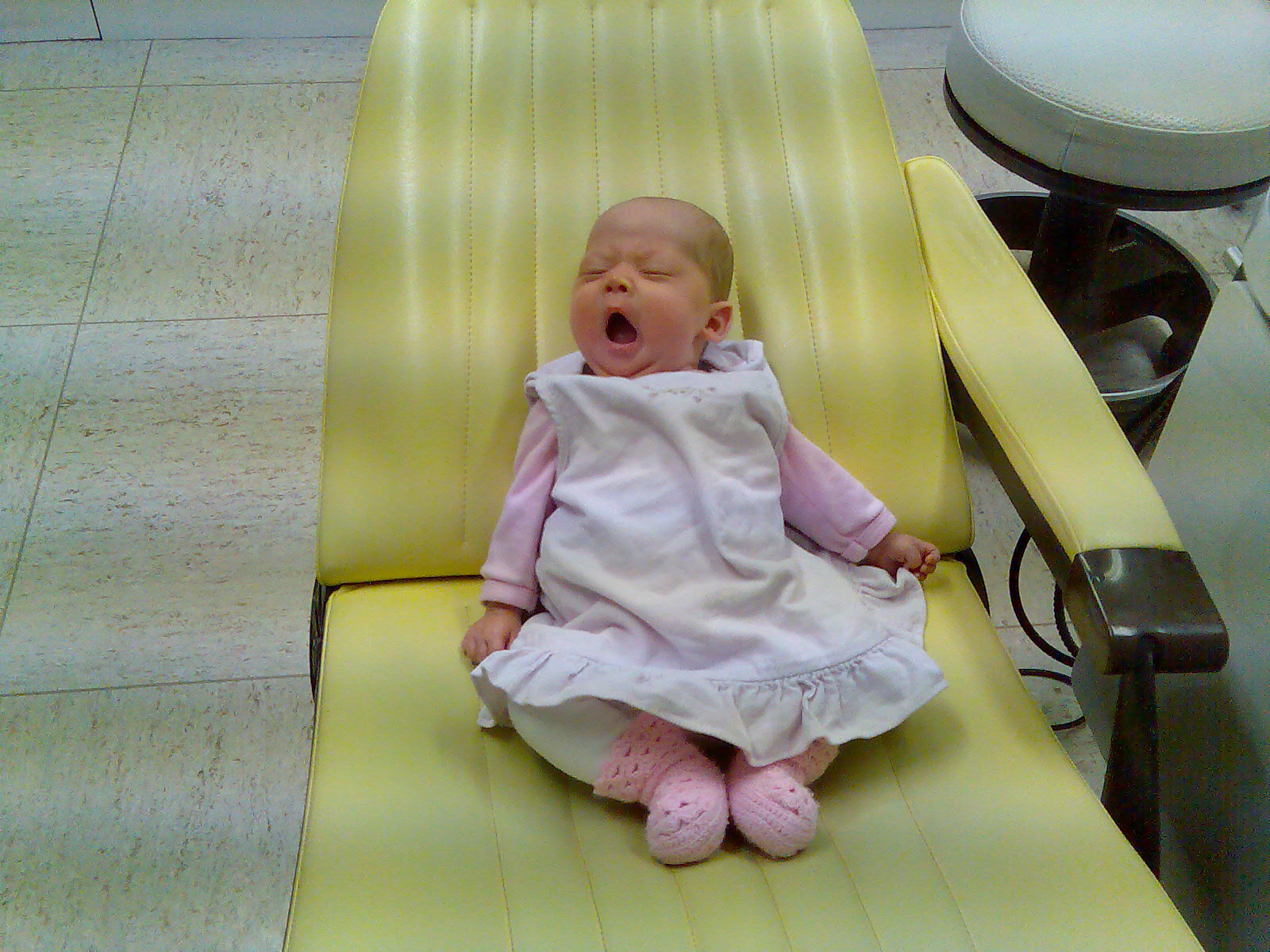 Hihi, meine Mutter ist doch Zahnärztin... Am Sonntag hatte sie Notdienst, da nimmt sie uns immer zur Kontroluntersuchung dran. Und da es von mir ein Foto gab, als meine Eltern ihre erste Praxis eröffneten, musst ich von Emma natürlich das gleiche Motiv 32 jahre später wählen... Vielleicht finde ich das Bild ja, dann fotografiere ich es ab und stelle es rein...