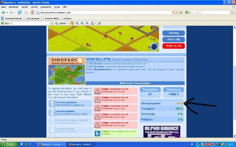 Du musst nix weiter tun, als den Link anklicken. Die Stadt baut sich von ganz alleine. Und die ganzen Arbeitslosen kommen daher, weil ich zu wenige Firmen habe. Die Firma kommt zustande wenn einer die Seite besucht, wann das sein wird ist nicht zu vorhersagen. Keine neue Firma, keine neue Arbeit. Hab mir jetzt ne neue Stadt gemacht, mal schauen ob ich da auch soviel Arbeitslose habe