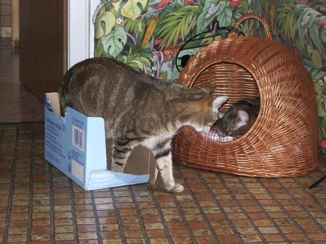 Kurt liegt im Körbchen - Phisto in seinem Karton - überlegt aber dass es vielleicht doch schöner wäre mit Brüderchen zu kuscheln *g*