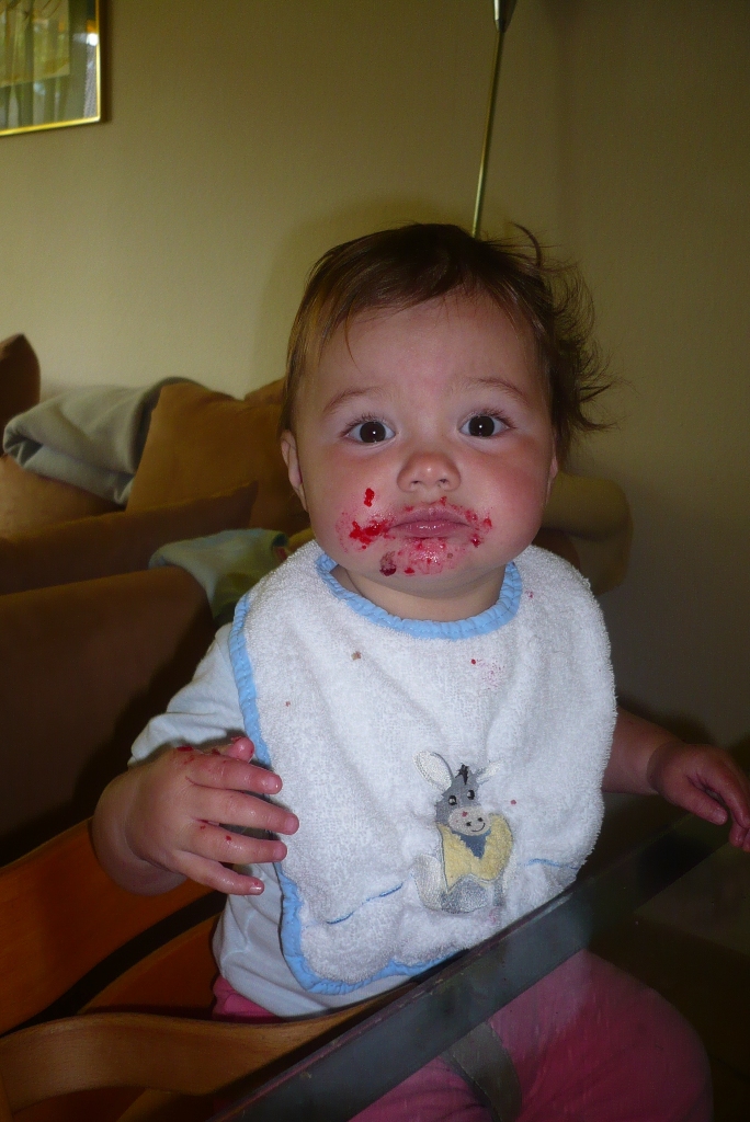 Das Bild habe ich anlässlich des ersten Marmeladenbrots gemacht (in kleine Stücke geschnitten und natürlich mit selbstgemachter Marmelade). Die abstehenden Haare wurden durch marmeladenverschmierten Hände verursacht.