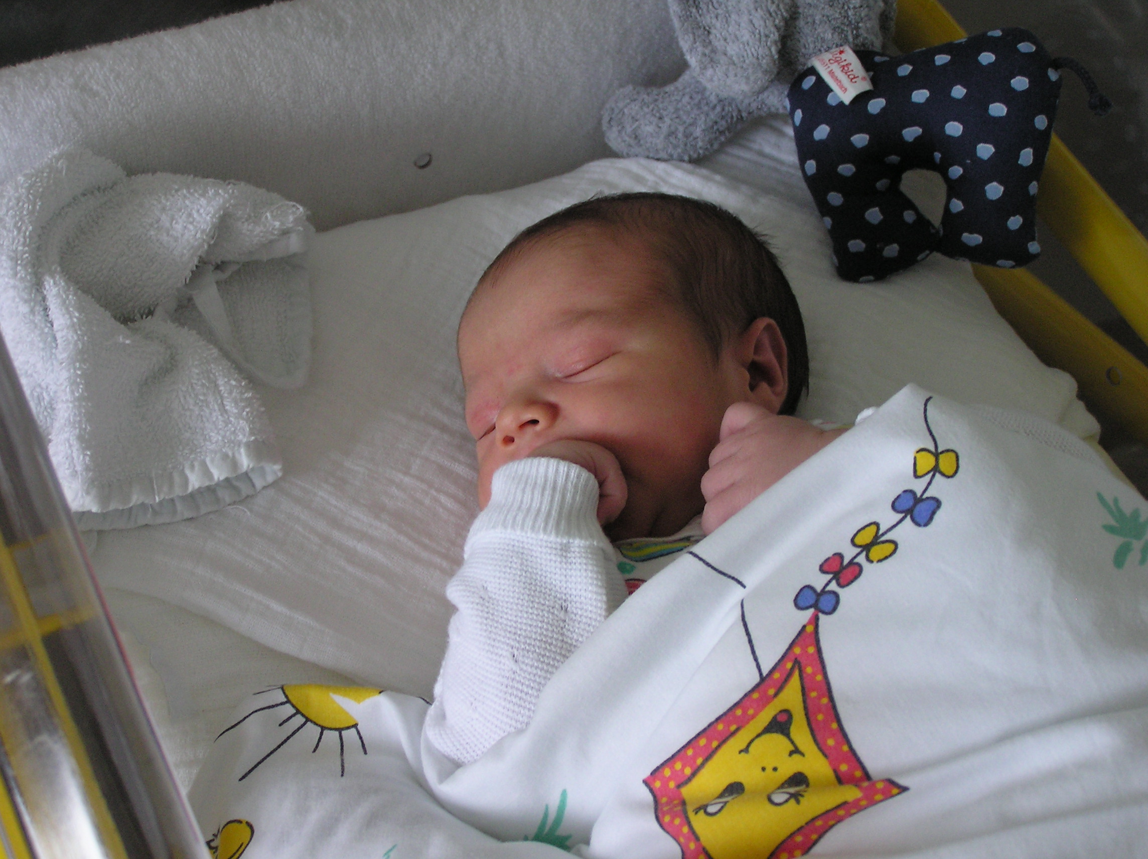 Ja so war das. Nun noch ein paar Fotos von dem Kleinen. Eins Minuten nach der Geburt und eins