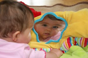 Heute war auch großer Spiegel-Tag. Wir üben ja schon immer vor dem Schlafzimmerspiegel "Wo ist das Baby?" Heute hatte sie auch bei der Oma einen Kosmetikspiegel in der Hand. Erst hat sie gejuchzt, als sie das Baby gesehen hat, dann ist sie mit offenem Schnabel nach vorne und hat dem Baby einen Schmatz aufgedrückt. Sooo süüüüüß!!!