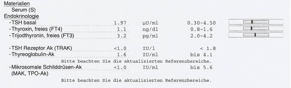 limbo: ein US der SD würde das Bild abrunden. Könntet Ihr vielleicht schon mal in Angriff nehmen. Keine SD-Antikörper ist schon mal gut. Manche Ärzte empfehlen trotzdem wegen Kiwu eine kleine Thyroxin-Dosis, so dass der TSH etwas sinkt.