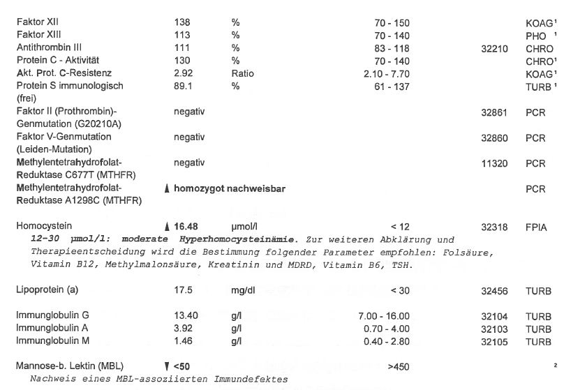 MTHFR: hab ich auch 4g/4g homozygot << Muss dafuer Heparin spritzen und Folsaeure 5mg nehmen, weil mein Koerper die Folsaeure aus den anderen Tabletten nicht ganz umstetzt. Sprich das wenige wird noch weniger. Um aber den gesunden Level zu haben, muss ich da mehr futtern. (Im Gegensatz zu mir ist dein Homocystein um einiges geringer...)