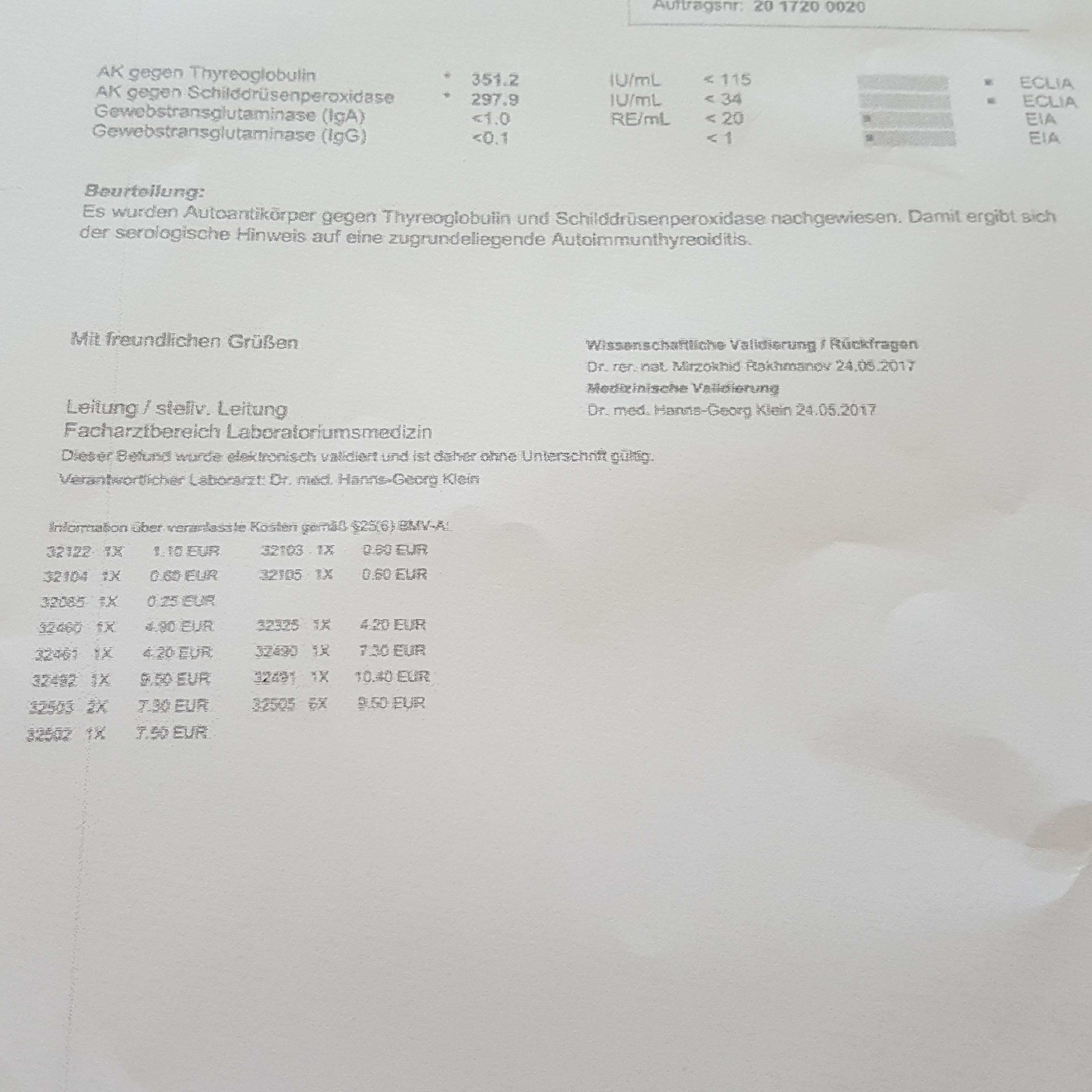 Durch die beiden nachgewiesenen TG- und TPO- Antikörper ergibt sich die Diagnose Hashimoto Thyreoiditis. Es sollten nun TSH, fT3 und fT4 bestimmt werden und dann ggf. mit L-Thyroxin substituiert werden. Der TSH sollte allgemein bei Kinderwunsch nicht höher als 1,5 liegen, besonders bei Hashimoto. Die Einstellung mit L-Thyroxin erfolgt in kleinen Schritten: z.B. mit 25mcg anfangen, dann Kontrolle 3 bis 4 Wochen später und dann weiter nachjustieren. Gerade bei Hashimoto empfiehlt es sich, die Anpassung an den freien Werten (also fT3 und fT4) zu orientieren.