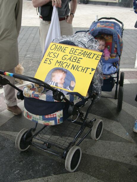 Untermalen könnten wir den Text mit einem oder zwei Fotos. Ich schlage ein Foto von unserer damaligen Demo vor. Auf diesem Foto ist ein Kinderwagen zu sehen, auf dem ein Plakat steht. Auf diesen Plakat ist zu lesen: „Ohne bezahlte ICSI gäbe es mich nicht!“