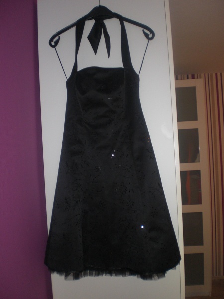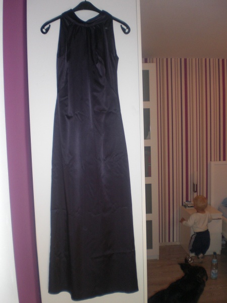 Ich werd dann morgen das kurze schwarze anziehen. Das lange ist aus so eine Art Satin-Stoff in gedecktem Lila. Es ist ärmellos, hat einen hoheh Kragen und wird im Nacken zusammengebunden. Auf dem Foto sieht es wirklich langweilig aus, aber angezogen fand ich es super schick...
