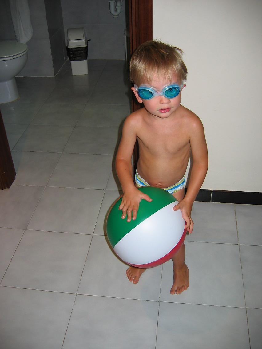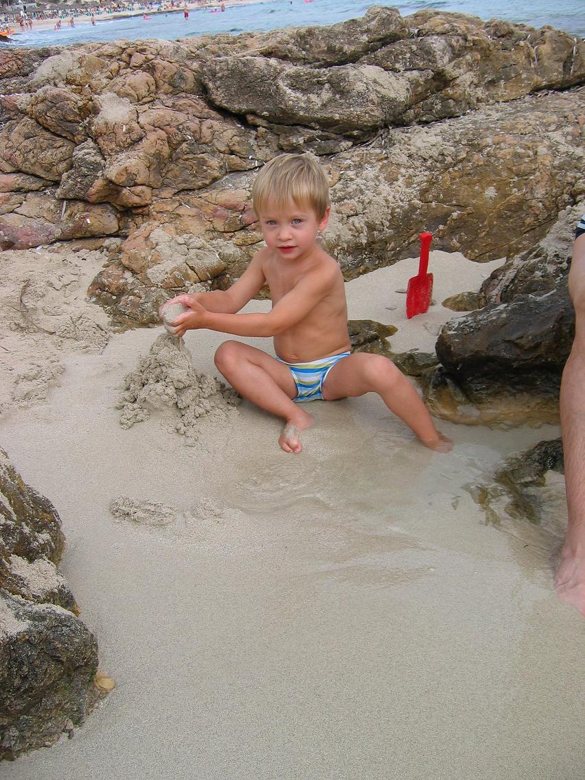 Aber es ging danach dann echt super! Wir mußten immer grinsen, wenn andere Familien mit ihren Kids am stressen waren und haben uns erleichtert angeschaut....zum Glück nicht wir. Aber im Hotel waren sie alle ganz kinderfreundlich. Wir konnten abends auch noch in der Bar ein paar Sangrias geniessen, da wir unser Zimmer direkt oben dran hatten und von unserem Balkon aus auf die Terasse schauenkonnten. Brauchte nicht mal ein Babyphon. Jeden zweiten tag war bei uns Kinderdisco, was Max total faszinierend fand....die Kinder, die tanzen und hopsen. die anderen Tage war die Disco im Hotel nebendran, dass dazugehörte (wir waren im Apartmenthotel). Um 22.00Uhr war aber die musik wieder aus, was o.k. war, so konnte Max dann auch gut schlafen. Mia hat nicht mal der Lärm was ausgemacht und war eigentlich jeden Tag um 20.00Urh spätestens im Bett. Außer wir sind zum Hafen gewandert, dann habe ich sie in den Babybjörn und sie hat interessiert rumgeschaut, bis der Schlaf sie übermannt hat. Max hat das natürlich gentutz um in den Buggy zu sitzen und so die Gegend zu geniessen. War auch o.k., denn er war abends oder nach dem Strand schon ganz schon müde. Begeistert war er natürlich von dem tollen Sandstrand und er war jeden Tag am Baggern.