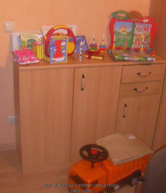 es gab nen kinderkassettenrecorder + Kassetten,CD,müllauto zum draufsetzen und rumfahren,das vtechbuch,die 1. schuhe. von oma+opa nen sandkasten.