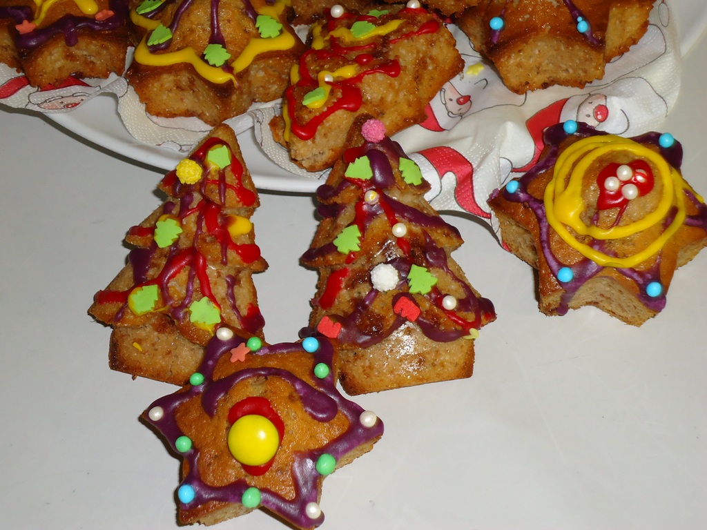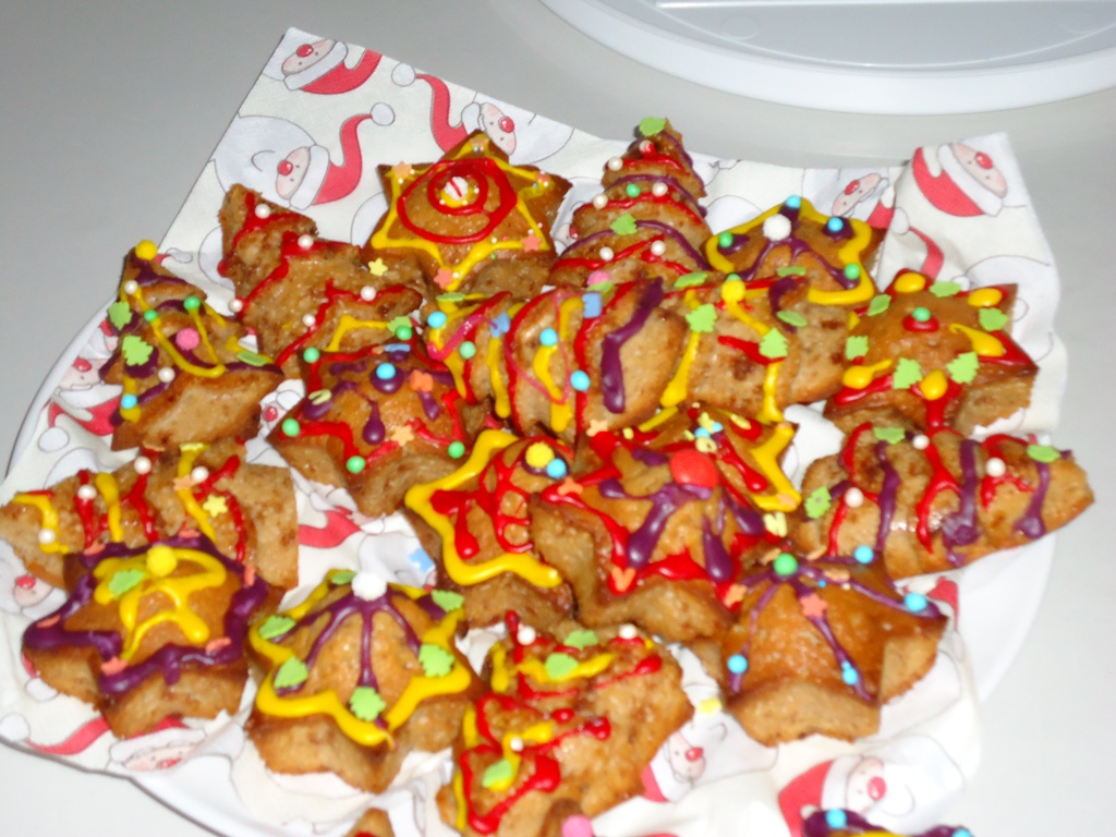 Als wir beim Orthopäden waren, hat mir Franca gesagt, das sie morgen am letzten Schultag alle Plätzchen mitbringen sollen und Spiele. Dann kam ein ICH KANN JA NUR SPIELE MITBRINGEN und was sagt ne bescheuerte Mutter? Wir können ja heute noch was zum mitnehmen backen :argh: :argh: . Um halb sieben heute abend ist dem Kind dann eingefallen, das wir ja heute noch backen wollten :kreisch: , versprochen ist versprochen. Jetzt liegen hier Tannenbäume und Sterne, verziert und bestimmt total lecker, aber durchgezählt :wink: . Jetzt bringe ich morgen das Kind halt selbst in die Schule, hoffentlich gibts dann wenigstens von den Mitschülern und dem Dragoner ein Lob *pfeif* .