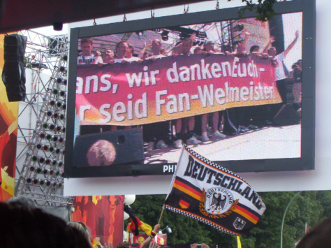 Claudi Was sollen wir jetzt nur machen, nachdem die nächste WM erst in 4Jahren stattfindet :-? ? Ich war zum Halbfinale Deutschland/Italien auch in Berlin. Habe dort allerdings nur die Verlängerung im Hotel gesehen. Eigentlich wollte ich mit meiner Kollegin nach dem Sieg noch rausgehen... nach dem 2.Italien-Tor sind wir aber lieber gleich zu Bett :roll: