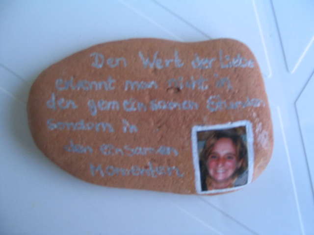 also mein schatz hat jedes geburtstag wenn er sein männerurlaub in sardinien macht, letztes jahr hab ich einen stein aus meinem letzte urlaub genommen, der ist so terrakottafarben, habe ein bild von mir genommen,es stark verkleinert und auf fotopapier gedruckt (das papier wo man nachher auf t-shirt bügeln kann), dann hab ich mittel serviettentechnik das bild auf den stein gebracht und mit silberstift einen spruch dazu geschrieben. hier ein foto: