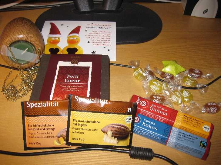 zunächst habe ich eine schocko-knapper-mischung der seidel-confiserie erhalten. ich darf dick werden *g* , gleich kommt der nächste Dickmacher ein Prailine-Happen mit süssem Grüß aus Frankfurt- stammt der Wichtel vom Main