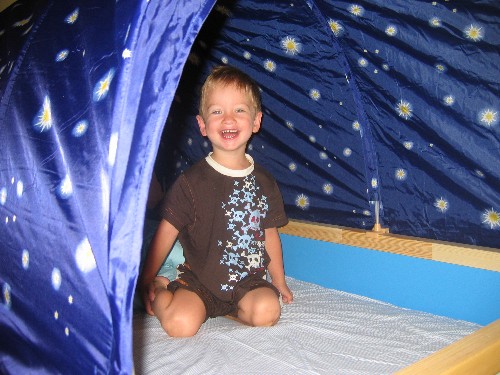 Das ist ein Hochbett. Ursprünglich wollte ich ein niedriges, konnte mich aber nicht richtig entschließen und als wir im Ikea waren, war Max gleich auf das Teil hochgeklettert und Alex hat eh zu einem Hochbett tendiert (ich eher nicht, muß ja schließlich die Betten machen und drunter könnte es mit der Zeit auch chaotisch aussehen :?: ) also war das dann schnell klar. Den Himmel finde ich selber auch einfach zu dunkel, was helles hätte mir besser gefallen, aber Max stört es nicht. Findet seine Höhle toll *pfeif* Das gute ist, er ist im dunkeln zu ängstlich runter zu klettern, so daß sich meine Angst "ohne Stäbe springt er in der Gegend rum" überflüssig war *g* wird sich sicher noch ändern, aber bis jetzt klappts :nanana: