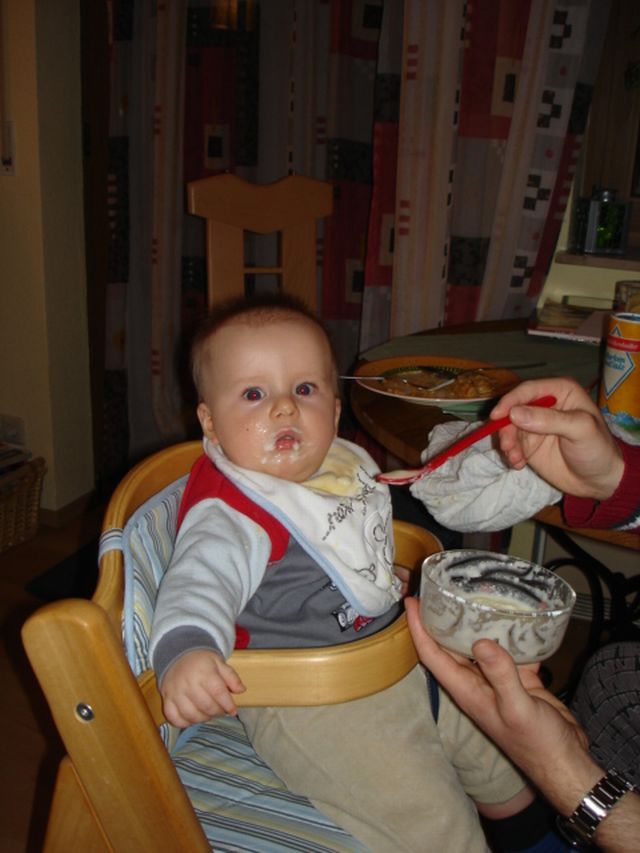 Schau mal wir haben heute Lukas das 1. mal in seinen Hochstuhl gesetzt. Er kann zwar noch nicht alleine sitzen, aber so hatten wir wenigstens mal ruhe beim Essen.