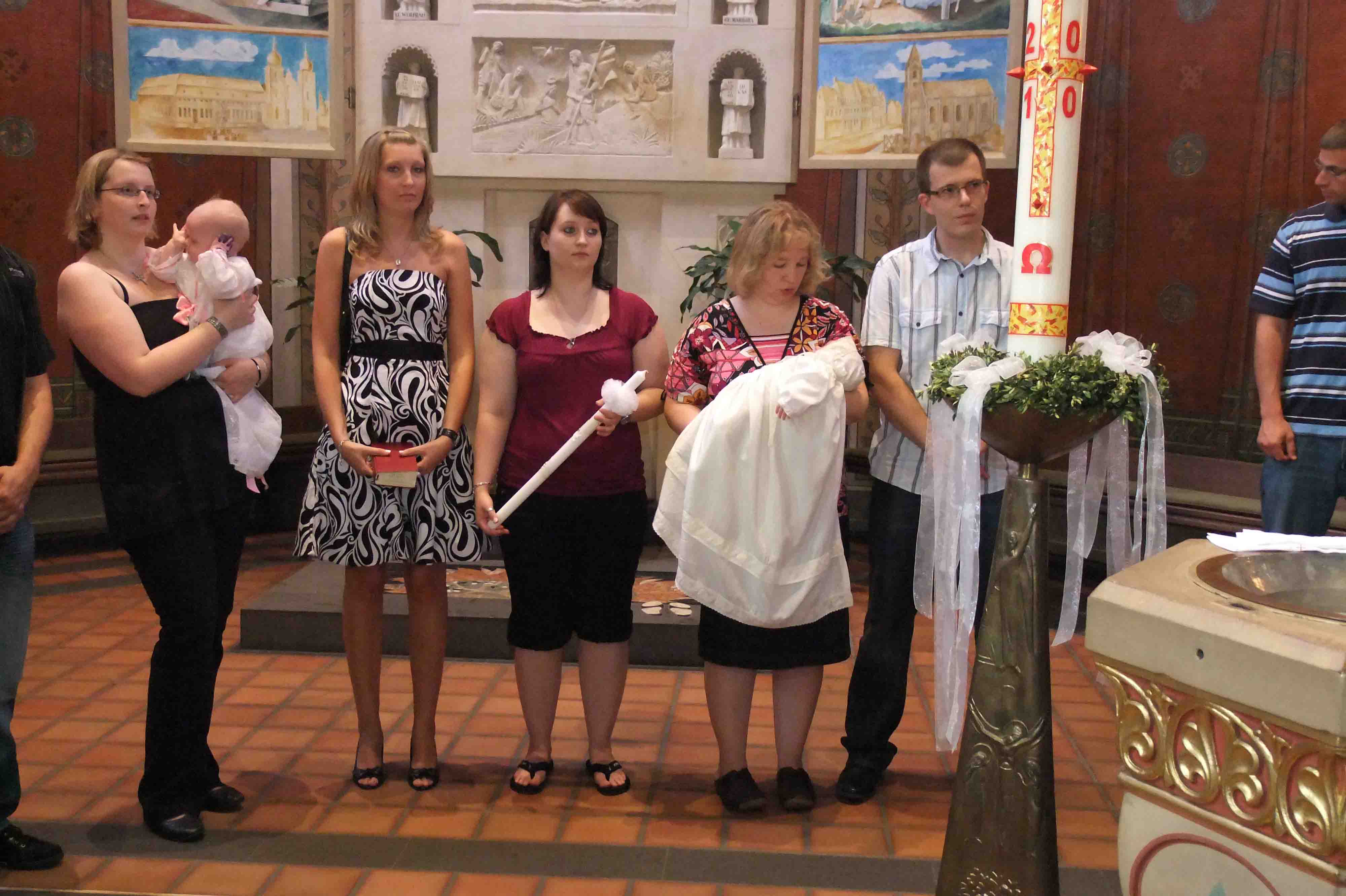 Der Pastor hat recht flott gemacht (waren ja auch 3 Kinder). Er hat uns zur "Taufzeremonie" alle, also auch die Familien und Taufgesellschaften mit an den Altar und das Taufbecken genommen (waren dann also um die 50 Leute um das Becken versammelt) und sogar meine fast 86 Jahre alte Oma ging mit. Naja, sie fing zwar währenddessen wieder an zu zittern (beginnende Parkinson), aber sie hat tapfer durchgehalten. Und danach haben wir uns es bei uns zu Hause gemütlich gemacht. Unser Gummibärchen war megabrav und hat das Ganze, wie 2007 auch sein großer Bruder, verpennt. Noch nicht mal als das Wasser über den Kopf kam hat er sich bemüht die Augen zu öffnen, was will man mehr?