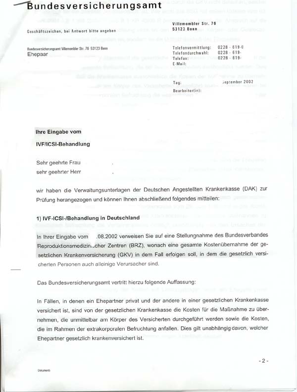 - Seite 1 eines Briefes des Bundesversicherungsamtes. Hierin wird bestätigt, daß die Gesetzliche KV einerseits die Kosten übernehmen muß, die bei ihrem Versicherten anfallen und andererseits die Kosten tragen muß, die keinem Ehegatten zugeordnet werden können und daher als extrakorporal bezeichnet werden.