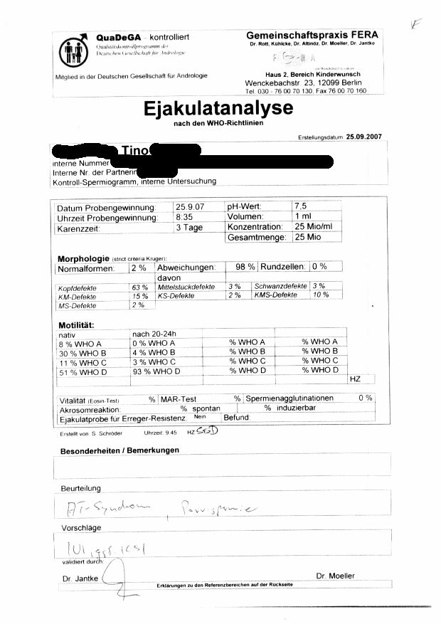 Im Detail habe ich das SG nicht vorliegen, aber die Morphologie war grottenschlecht. Nur 2% Normalgeformte!