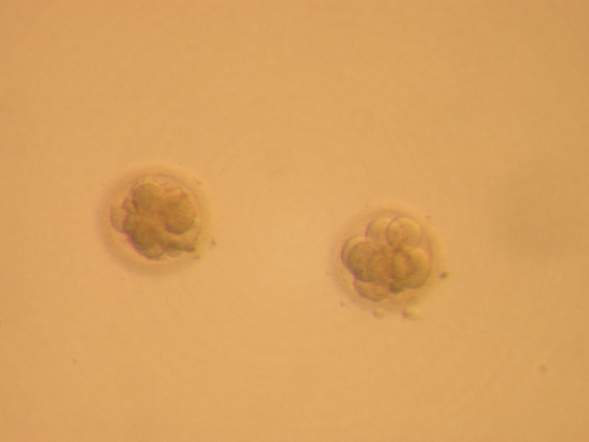 Der linke Embryo ist schwieriger einzustufen, er liegt wohl auch in dem Rahmen zw. 4 bis 8 Zellen, wirkt aber nicht so gleichmäßig. Um einen Embryo einstufen zu können, muss man am Mikroskop alle Ebenen des Embryos fokusieren, ein Photo, das nur eine Ebene des Embryos darstellt, lässt manchmal keine genaue Aussage zu.