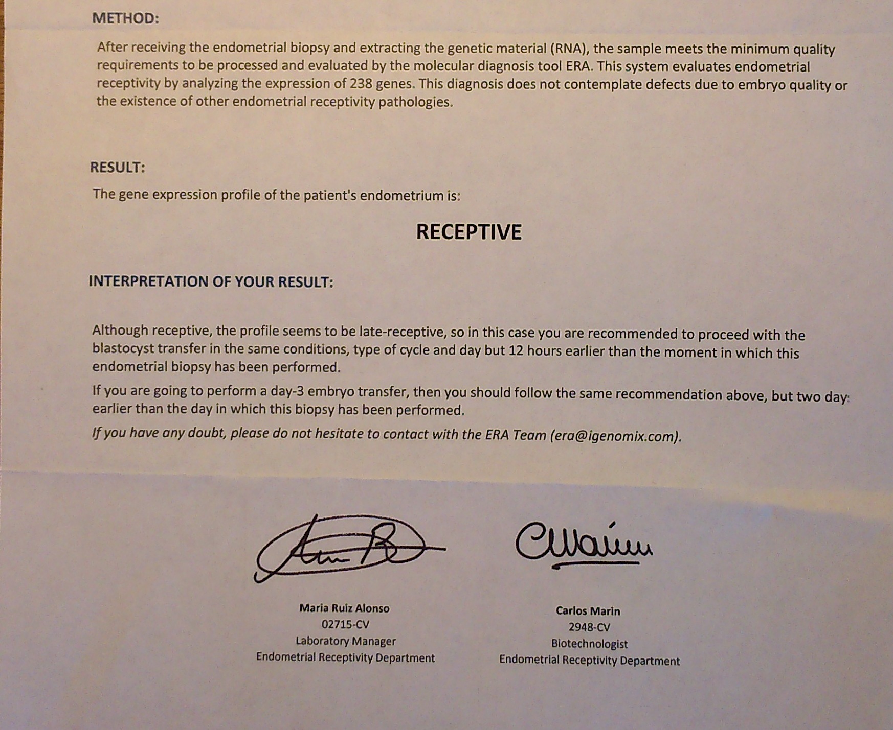 ich habe im Mai eine ERA machen lassen und habe während meines Urlaubes die Ergebnisse bekommen. Jetzt ist der Doc im Urlaub.