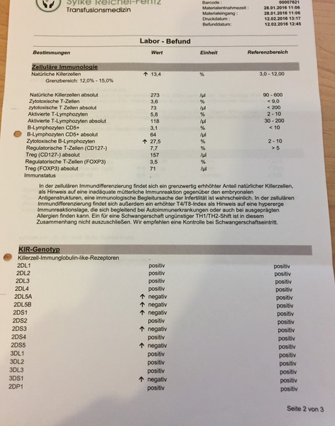 Befund RF: KIR AA, leicht erhöhte NK + Aktivität, HLA (25% DQA), Epitop C2 negativ, PAI heterozygot, neg. Cross Match