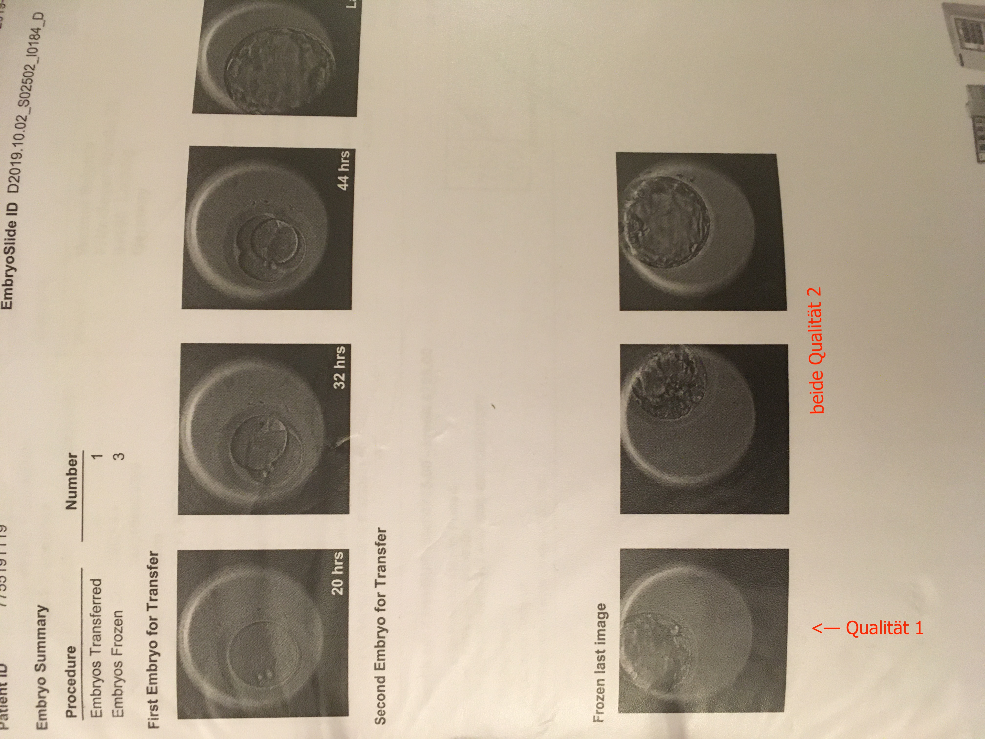 Jetzt habe ich noch 3 eingefrorene Embryos. Die Sache ist die: die Klinik teilt nur nach Schulnoten ein. Ich habe schon mehrfach nachgefragt, was eine "1" und was eine "2" bedeutet. Habe aber bisher keine Antwort erhalten. Sind die eingefrorenen dann auch Blastozysten? (Wann wurden die eingefroren? Können Sie das anhand der Fotos einschätzen? Die Fotos stammen vom Transfertag, aber ich hatte mich zwei Tage davor entschieden, nur einen Embryo zu nehmen und drei einfrieren zu lassen.)